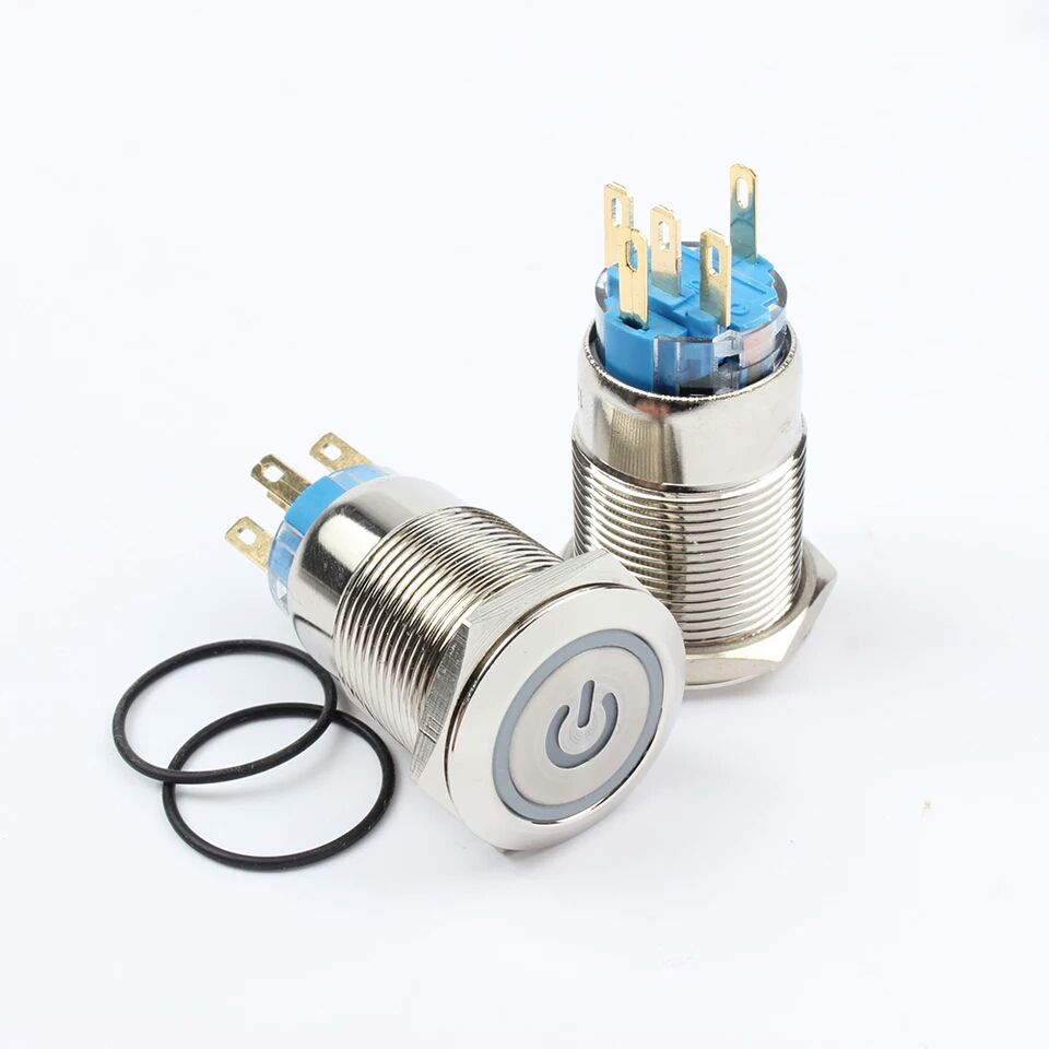 Botão com led 19mm em aço inoxidável (não enferruja) para uso genérico resistente a água e a vandalismo, opera até 250V AC/DC, acionamento do LED 12/24V