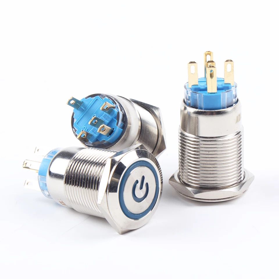 Botão com led 19mm em aço inoxidável (não enferruja) para uso genérico resistente a água e a vandalismo, opera até 250V AC/DC, acionamento do LED 12/24v